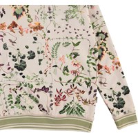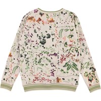 Raewyn ist eine rosa Bluse mit Prints von Wildblumen und Blättern. Die Bluse hat Raglanärmel und grün gestreifte Rippkanten an Ärmel, Saum und Halsausschnitt.