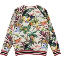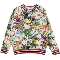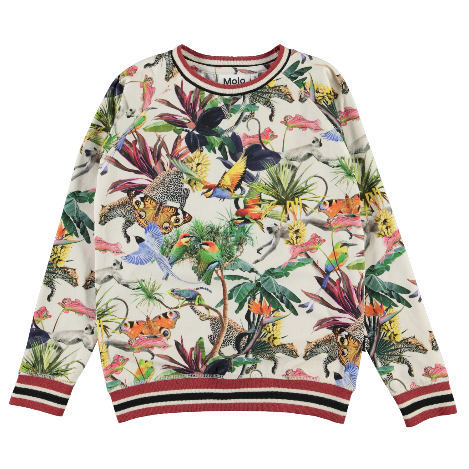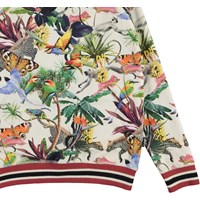 Raewyn ist eine Bluse mit dem Aufdruck 'Imaginary Jungle', die wunderschöne bunte Tiere hat. Die Bluse hat Raglanärmel und rot gestreifte Rippkanten an Ärmel, Saum und Halsausschnitt.