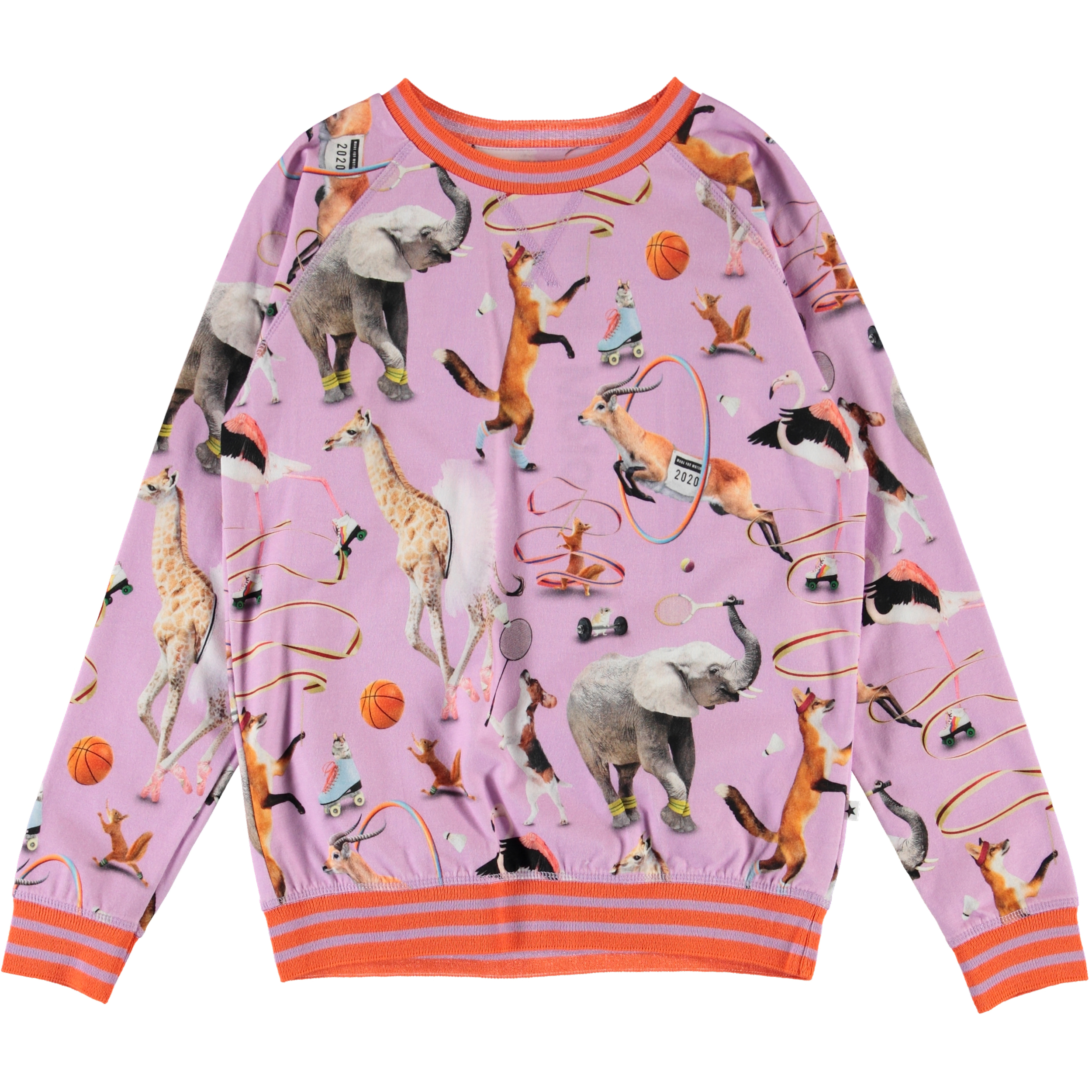 Raewyn ist eine lila Bluse mit langen Ärmeln und einem All-over Druck von Tieren, die verschiedene Sportarten ausüben. Raewyn hat eine Rippkante am Hals, am Ärmelverschluss und unten, die der Farbe des Drucks entspricht.