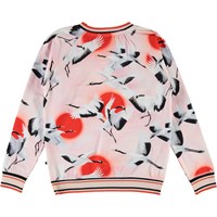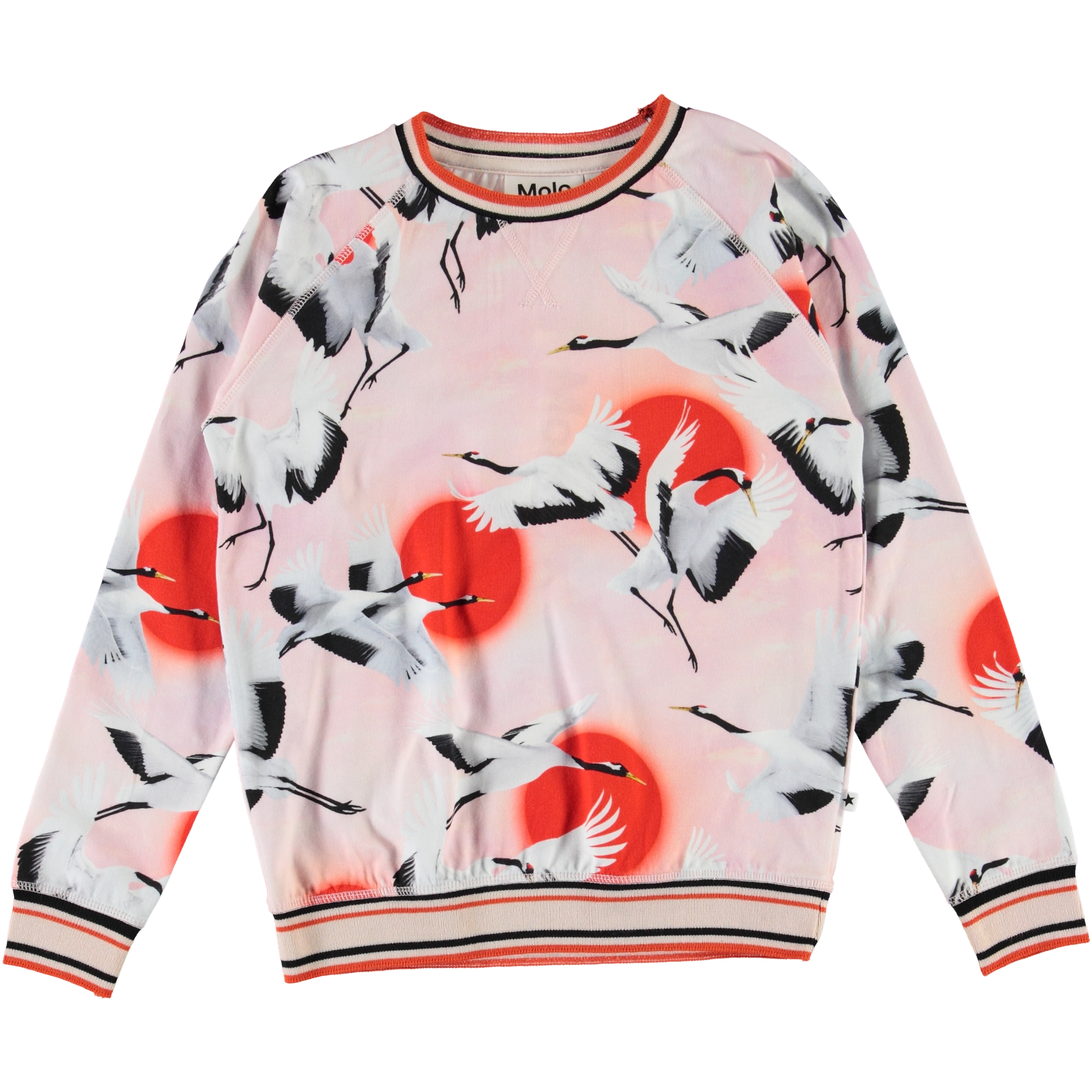 Raewyn ist eine rosa Bluse mit langen Ärmeln und Druck von großen roten Punkten und fliegenden Kranichen. Raewyn hat eine Rippkante am Hals, am Ärmelende und unten, die der Farbe des Drucks entspricht.