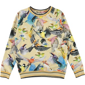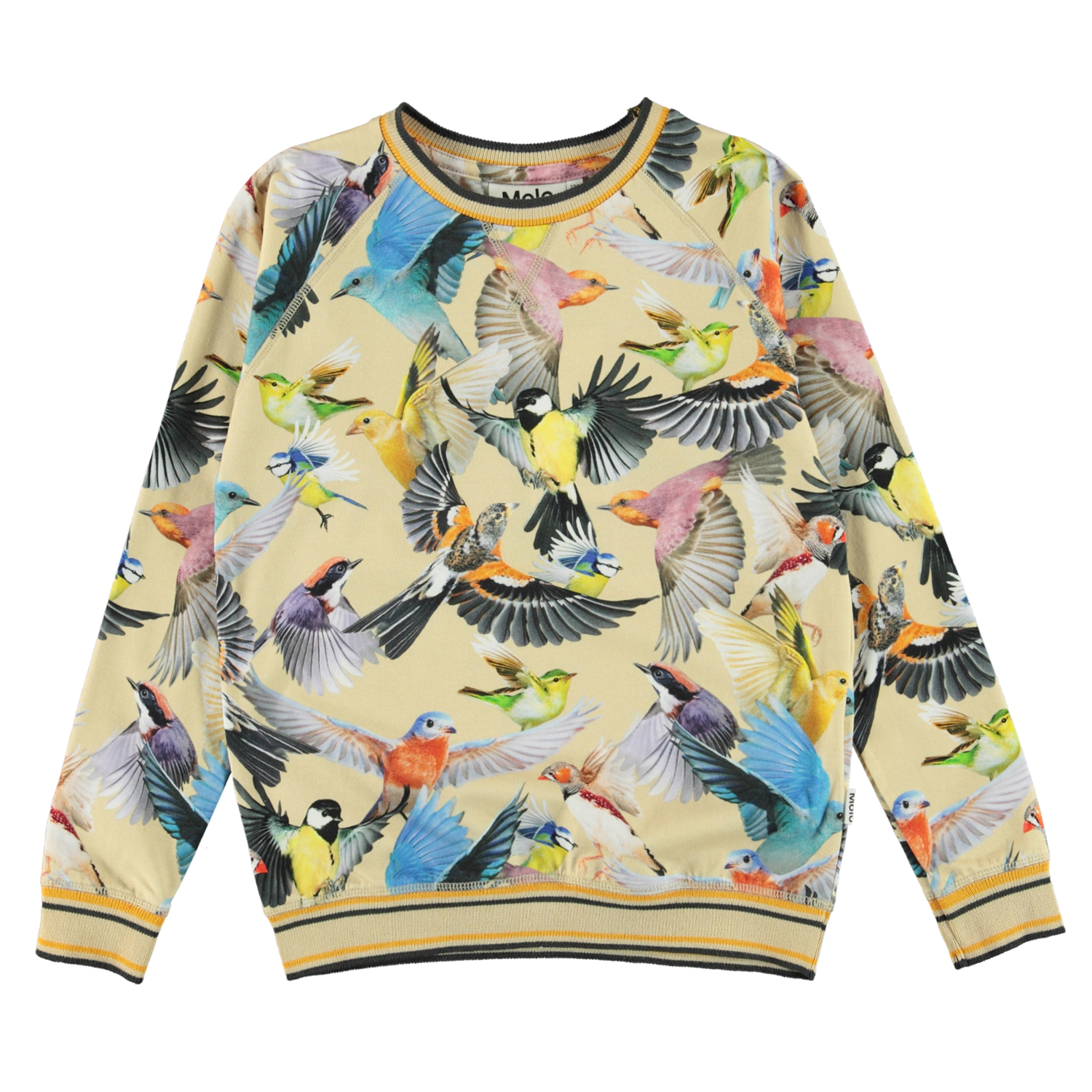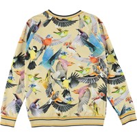 Raewyn ist ein hellgelbes Langarmshirt mit langen Ärmeln und Allover-Print mit bunten Vögeln. Raewyn hat einen gestreiften, gerippten Saum an Halsausschnitt, Ärmelende und Saum, der farblich zum Druck passt.