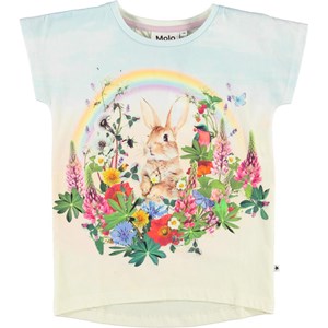 Ragnhilde ist ein T-Shirt mit kurzen Ärmeln und feinem Print eines süßen Kaninchen umgeben von Wiesenblumen und einem Regenbogen. Das T-Shirt ist aus 100% Baumwolle.