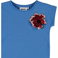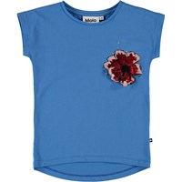 Ragnhilde ist ein blaues T-Shirt mit aufgesetzter Paillettenblume auf der Brust. Das T-Shirt hat mehr Länge der Rückseite