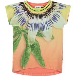 Ragnhilde ist ein orange-gelbes T-Shirt mit kurzen Ärmeln und einem Aufdruck eines Blumenkranzes um den Hals. Das T-Shirt hat hinten mehr Länge.