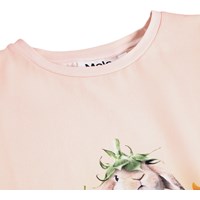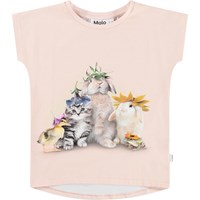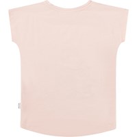 Rosa T-Shirt aus weicher, ökologischer Baumwolle mit kurzen Ärmeln, geripptem Halsausschnitt und längerem Rücken. Das T-Shirt hat eine normale Passform und einen bezaubernden Druck von Tieren mit Blumenhüten.