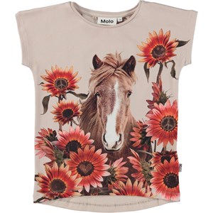 Rosafarbenes T-Shirt mit Frontdruck. Auf dem Druck ist ein süßes Pony zu sehen, das in einem Feld voller größer, roter Blumen steht. Dieses T-Shirt besteht zu 100% aus Baumwolle, kurze Ärmel, einen Rundhalsausschnitt mit gerippten Bündchen und eine normale Passform.