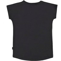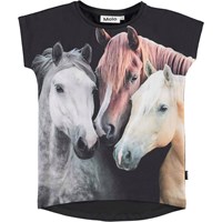 Ragnhilde ist ein schwarzes T-Shirt aus Öko-Baumwolle. Ragnhilde hat einen nach unten fallenden Saum auf der Rückseite und auf der Vorderseite sieht man den Aufdruck Triolets, wo 3 schöne und unterschiedliche Pferde ihre Köpfe zusammenstecken.