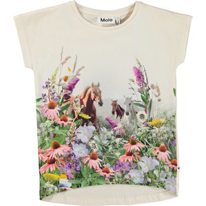 Leichtes Kurzarm-T-Shirt mit Placement-Printaus 100% Öko-Baumwolle. Der Druck zeigt Pferde, die durch eine wunderschöne und wilde Blumenwiese galoppieren. Das T-Shirt hat einen Rundhalsausschnitt mit Rippenbündchen, ist hinten etwas länger als vorne und hat eine normale Passform.