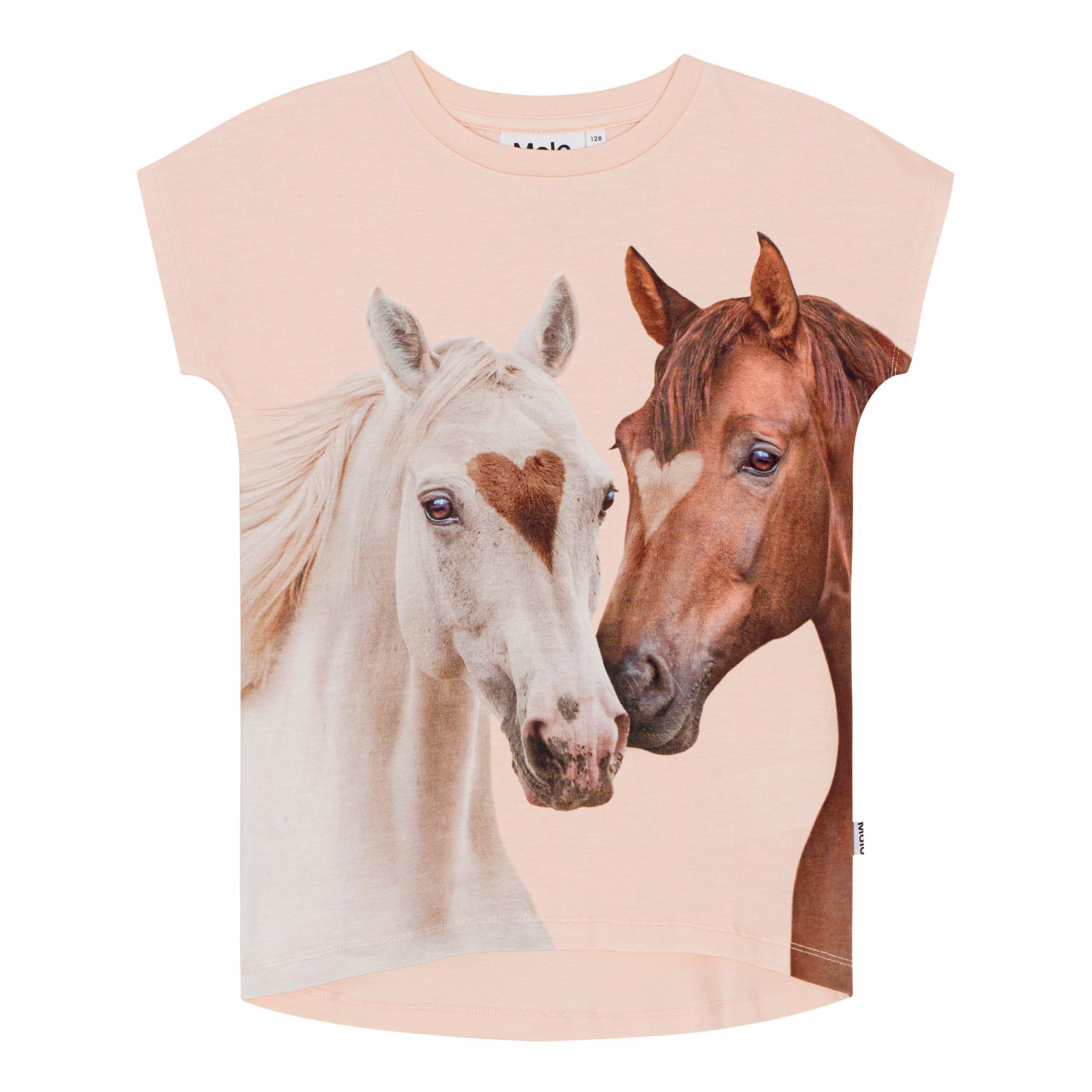 Weißes T-Shirt aus Öko-Baumwolle mit kurzen Ärmeln. Das T-Shirt hat eine gute Passform und reicht hinten weiter nach unten. Auf der Vorderseite befindet sich ein Aufdruck von zwei Pferden, mit Herzen auf der Schnauze.