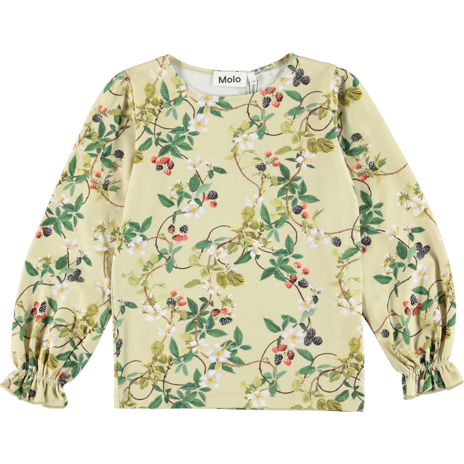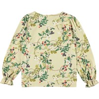 Raina ist ein hellgrünes Langarmshirt mit buntem Brombeerranken-Print. Die Ärmel haben eine leichte Weite und einen elastischen Ärmelabschluss.
