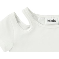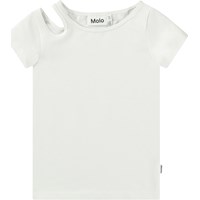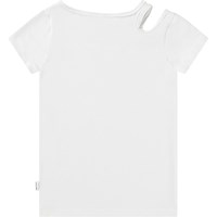 Eng anliegendes weißes T-Shirt aus Öko-Baumwolle mit einem Rundhalsausschnitt und einer Öffnung auf der rechten Schulter, die dem T-Shirt ein schönes Detail hinzufügt.