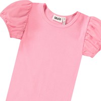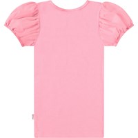 Pinkes figurbetontes T-Shirt aus weichem Öko-Baumwollripp mit Rundhalsausschnitt und Puffärmeln mit elastischem Abschluss.