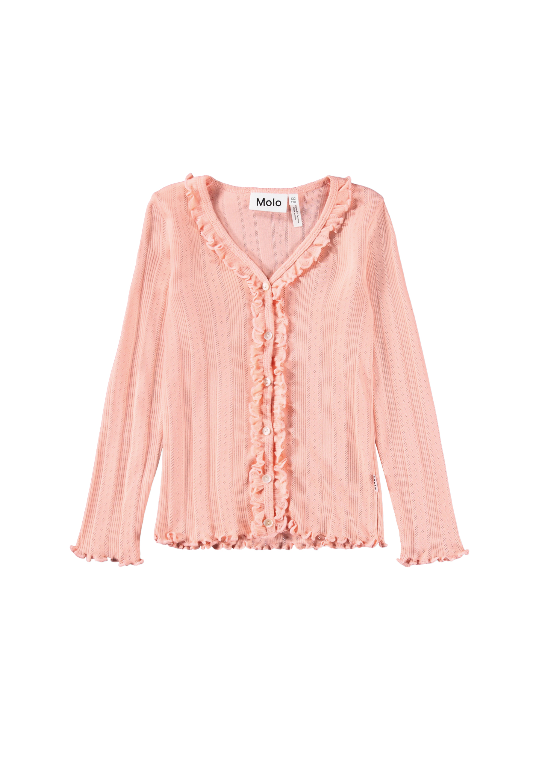 Pfirsichfarbenes Oberteil aus weichem, ökologischem Baumwolljersey mit schmalen Trägern und feinem Lochmuster. Das Modell hat eine enge Passform und einen gerafften, welligen Saum, der einen süßen und eleganten Ausdruck verleiht.
