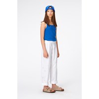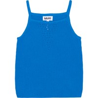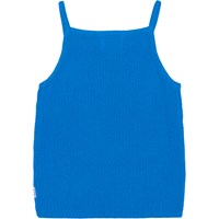 Blaues, gehäkeltes Trägertop aus Baumwolle. Das Oberteil hat schmale Träger und auf der Vorderseite ist ein elegantes Muster in Form eines Dreiecks gehäkelt. Kombinieren Sie das Oberteil mit passenden Shorts aus demselben Material für ein komplettes Set.