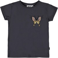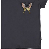 Ranva ist ein dunkelviolettes T-Shirt mit besticktem Schmetterling auf der Brust.