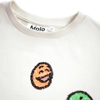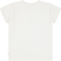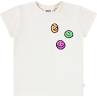 Off-weißes T-Shirt mit kurzen Ärmeln aus Öko-Baumwolle und Rundhalsausschnitt. Das T-Shirt hat eine normale Passform und auf der Brust sind 3 bunte, lächelnde Pailletten-Gesichter.