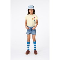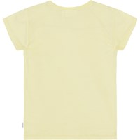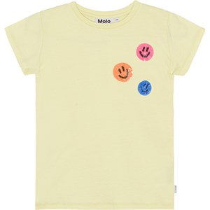 Pastellgelbes Kurzarm-T-Shirt aus Öko-Baumwolle mit drei kleinen Pailletten-Stickereien mit lächelnden Gesichtern auf der Brust. Das T-Shirt hat einen Rundhalsausschnitt und eine normale Passform.