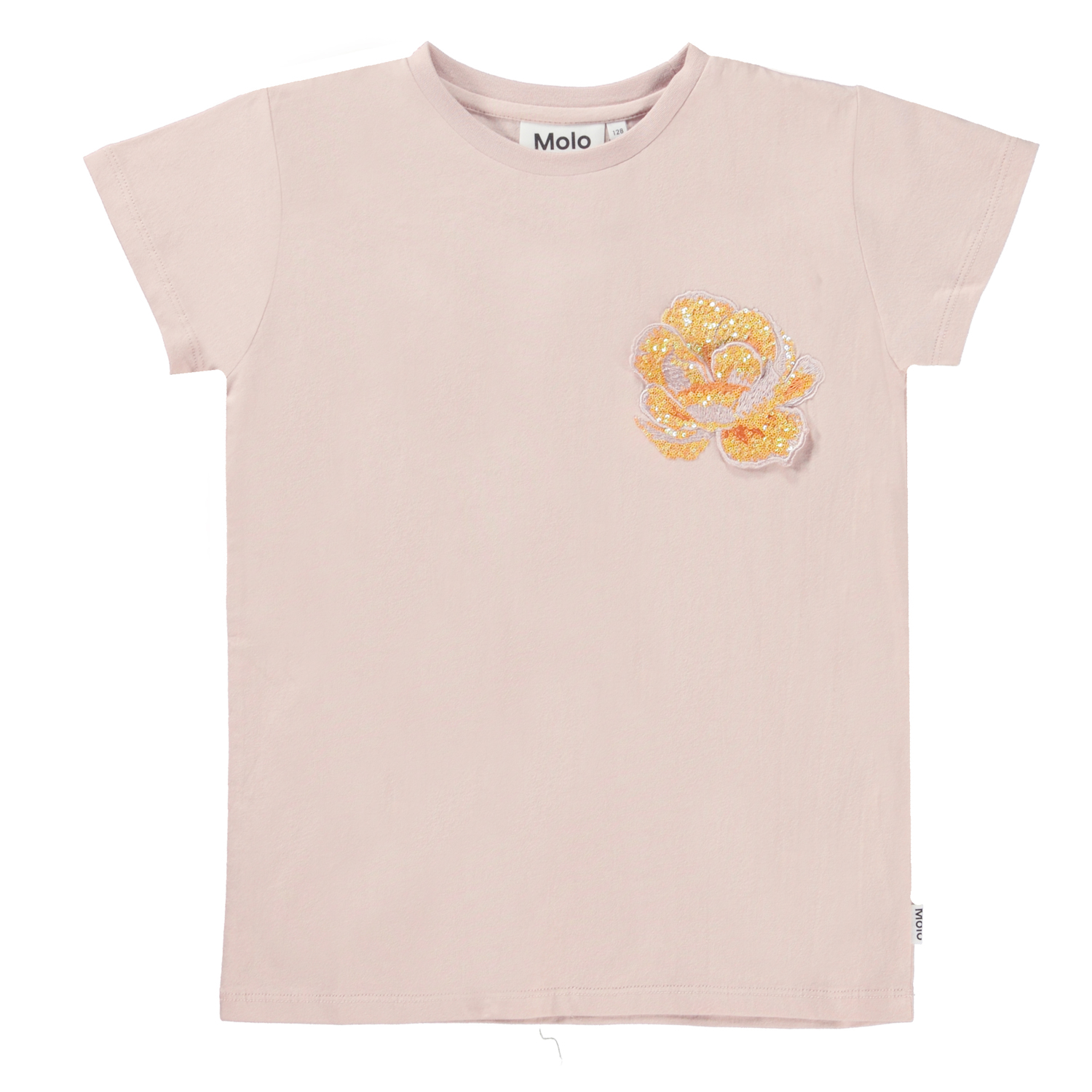 Ranva ist ein rosafarbenes T-Shirt aus Öko-Baumwolle. Ranva hat eine schmale Passform und eine rosa-orangefarbene Blume mit Pailletten, die auf der Brust aufgestickt ist.