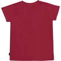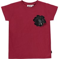Ranva ist ein dunkelrotes T-Shirt mit der Palliettenblume auf der Brust.