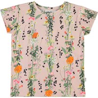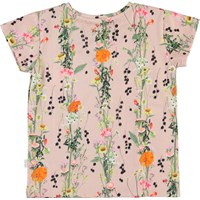 Ranva ist ein rosa T-Shirt mit Druck von vertikalen Blumenreben. Ecocert Greenlife, certifikationsnr. 197496.