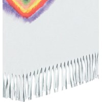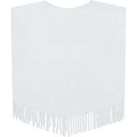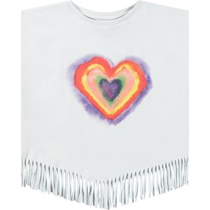 Weißes Oversized-Top aus Öko-Baumwolle mit geripptem Ausschnitt und Fransen am Saum. Das Top hat einen Aufdruck auf der Vorderseite eines Herzens in Regenbogenfarben.