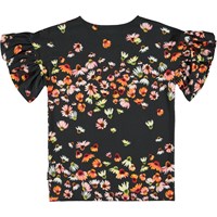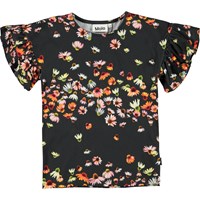Rayah ist ein schwarzes T-Shirt mit einem Aufdruck aus kleinen Blumen. Das T-Shirt hat schöne Rüschenärmel, die schön fallen.