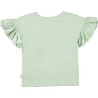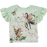 Rayah ist ein Top aus Öko-Baumwolle. Rayah hat einen drop-down Ärmel mit einer Rüsche an der Unterseite, die einen freien und verspielten Look verleiht. Das Oberteil hat den Placement-Druck Flying Horses, auf dem Pferde mit Schmetterlingsflügeln zu sehen sind, die zwischen großen Blumen herumfliegen.