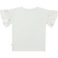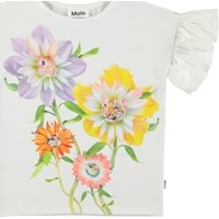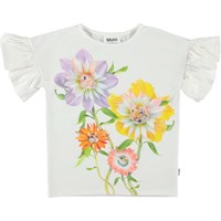 Rayah ist ein weißes T-Shirt mit einem Druck von Blumen Tierköpfen. Das T-Shirt hat kurze Rüschenärmel.