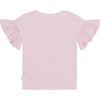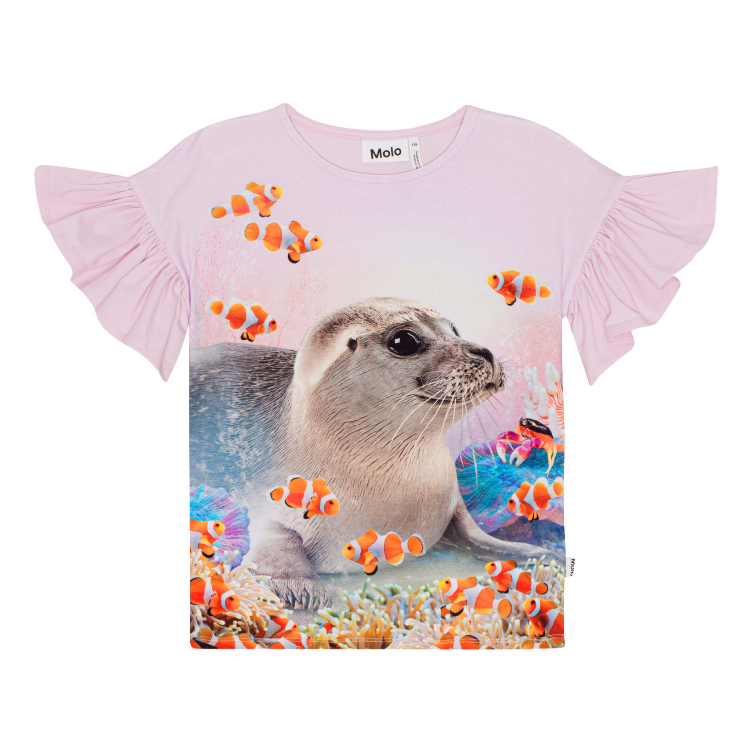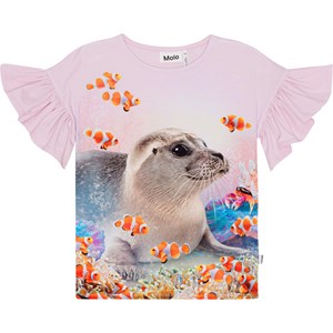 Rosafarbenes T-Shirt aus Öko-Baumwolle mit Rüschenärmeln. Auf der Vorderseite befindet sich der Aufdruck einer Robbe, umgeben von Nemo-Fischen in einem farbenfrohen Korallenriff.