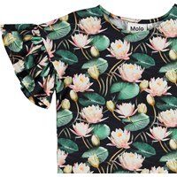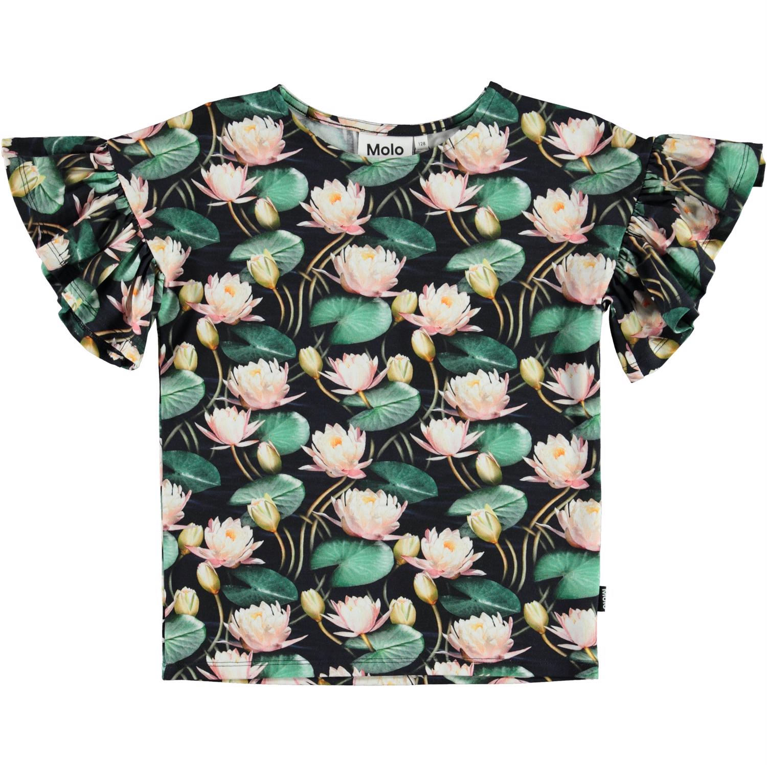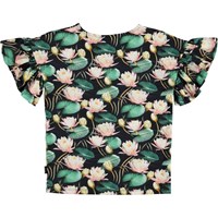 Rayah ist ein T-Shirt mit einem Aufdruck von feinen Seerosen. Das T-Shirt hat kurze Rüschenärmel.