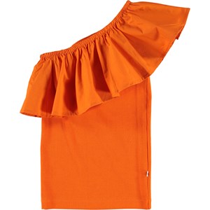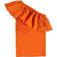 Rebecca ist das ultimative Sommertop mit einer asymmetrischen Form und den großartig Rüschen. Das Oberteil ist in Orange.
