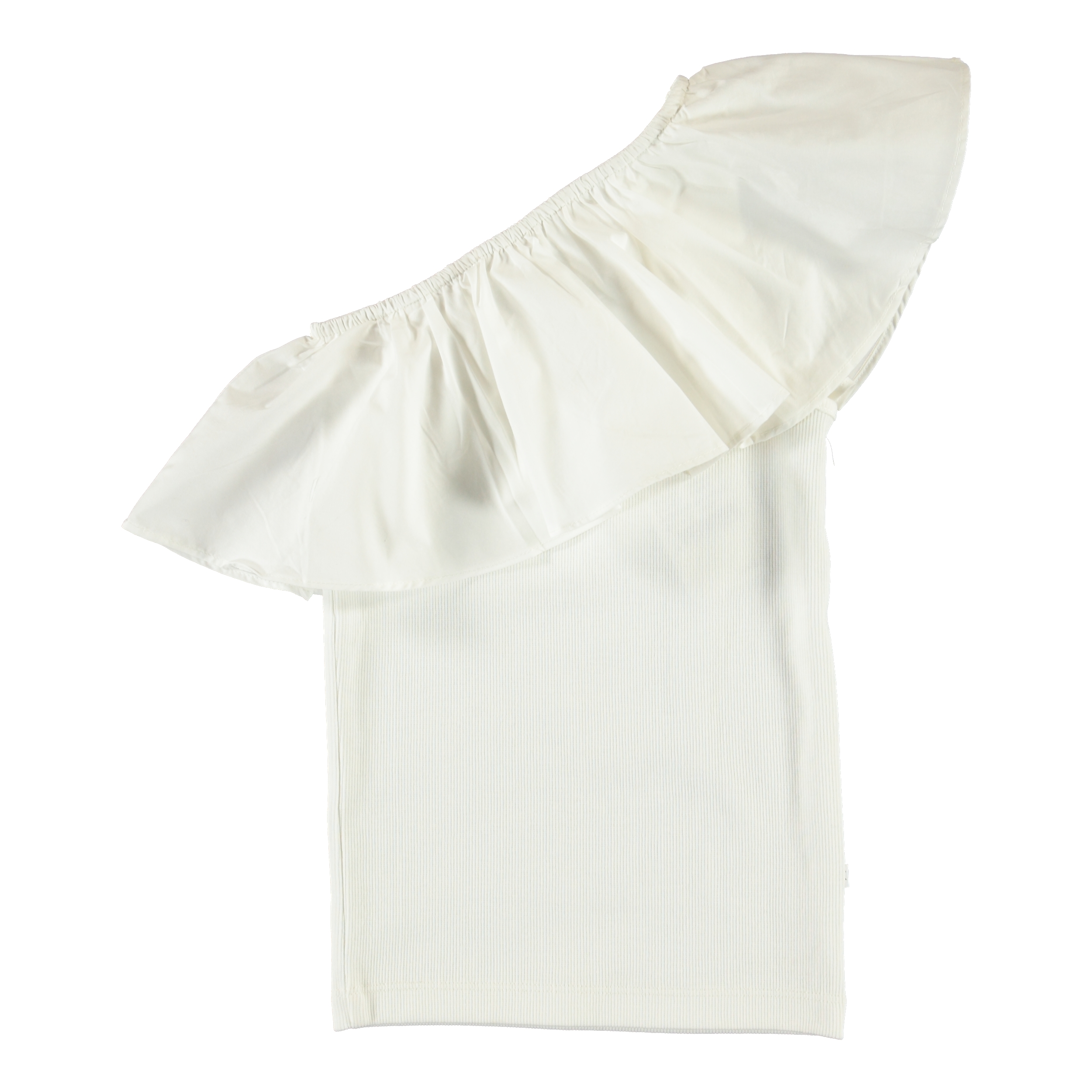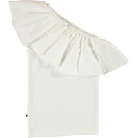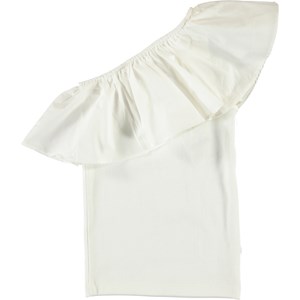 Rebecca ist das ultimative Sommertop mit einer asymmetrischen Form und den großartig Rüschen. Das Oberteil ist in Weiß.