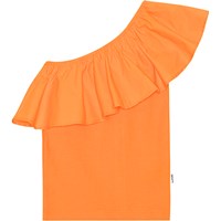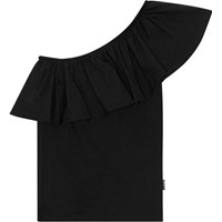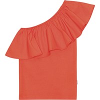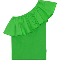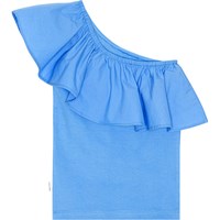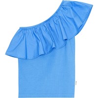 Blaues One-Shoulder-Top aus Öko-Baumwolle mit Stretch. Das Oberteil hat eine körpernahe Passform und eine breite Popeline-Rüsche am Ausschnitt.