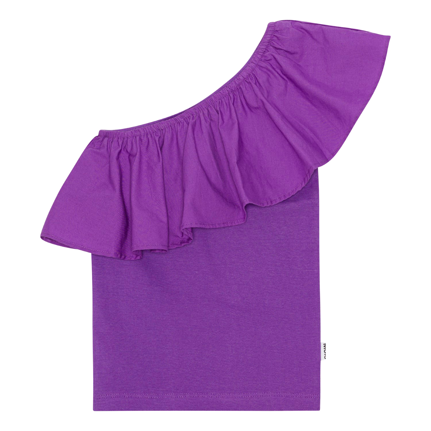 Lila One-Shoulder-Top aus Öko-Baumwolle mit Stretch. Das Oberteil hat eine körpernahe Passform und eine breite Popeline-Rüsche am Ausschnitt.