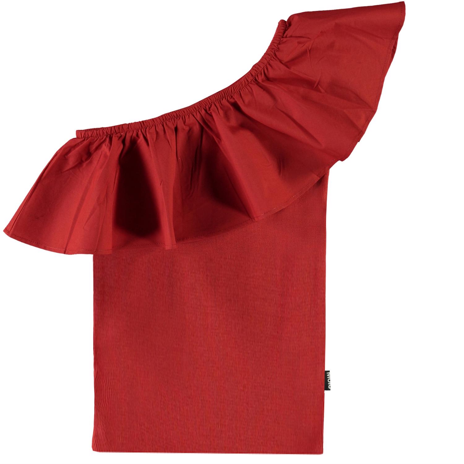 Rebecca ist eine roter asymmetrischer Top mit diagonaler Rüschenkante. Ecocert Greenlife, certifikationsnr. 197496.