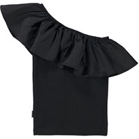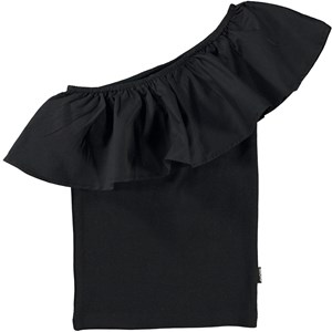 Rebecca ist ein schwarzes Top mit einem Schulterträger aus Öko-Baumwolle. Das Oberteil hat einen Stretch-Body und eine große, schöne Rüsche an der Schulter und ringsherum aus Popeline.