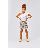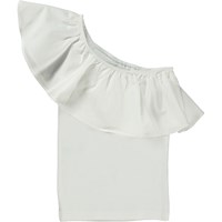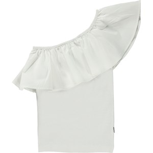 Rebecca ist ein weißes Top mit einem Schulterträger aus Öko-Baumwolle. Das Top hat einen Stretch-Body und eine große, schöne Popeline-Rüsche an der Schulter und drumherum.