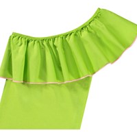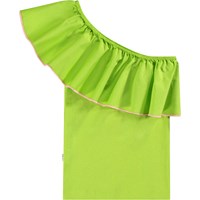 Grünes One-Shoulder-Top aus Öko-Baumwolle mit Stretch. Das Top hat eine eng anliegende Form und eine breite Popeline-Rüsche entlang des Ausschnitts.