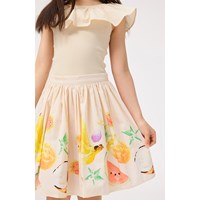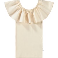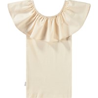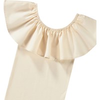 Beiges schulterfreies Oberteil ohne Ärmel aus weicher Öko-Baumwolle mit Stretch. Das Oberteil hat einen breiten Rüschenrand aus Popeline entlang des elastischen Ausschnitts, der es ermöglicht, den Kragen auch über die Schultern zu tragen.