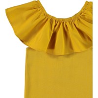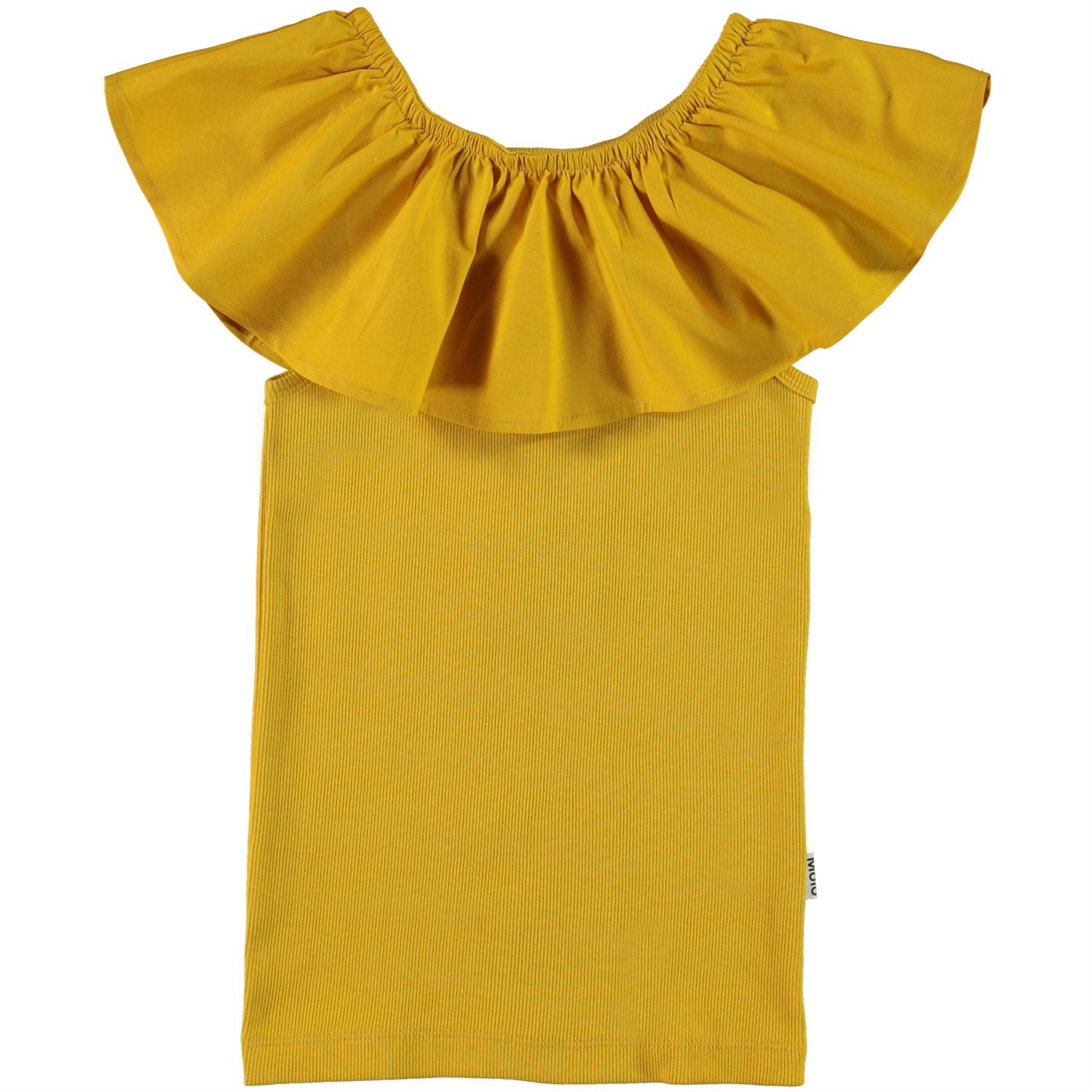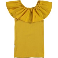 Reca ist ein goldenes Tanktop in Ripp mit einer großen Rüschenkante oben, die entweder auf den Schultern sitzen oder heruntergezogen werden kann, so das die Schultern frei sind.