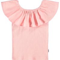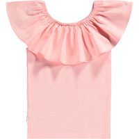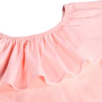 Rosa schulterfreies Oberteil ohne Ärmel aus weichem, ökologischem Baumwolljersey mit Stretch. Das Oberteil hat eine breite Poplin-Rüsche entlang des elastischen Ausschnitts, die es ermöglicht, den Kragen schulterfrei zu tragen.