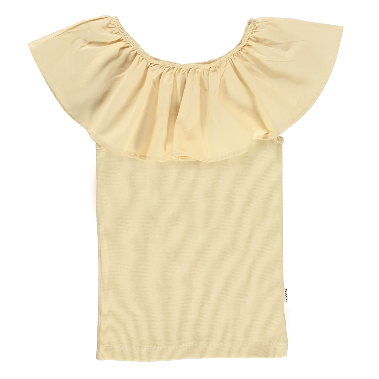 Reca ist ein hellgelbes Tanktop in Rippstrick mit einer großen Rüschenkante oben, die entweder auf den Schultern sitzen oder nach unten gezogen werden kann, damit die Schultern frei sind.