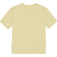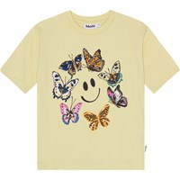 Gelbes Kurzarm-T-Shirt aus Öko-Baumwolle mit einem mehrfarbigen Aufdruck fröhlicher Schmetterlinge. Das T-Shirt hat einen Rundhalsausschnitt und eine normale Passform.
