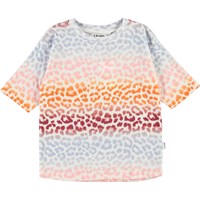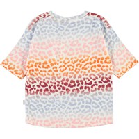 Reen, mit dem Aufdruck "Pastel Jaguar", ist ein T-Shirt mit Jaguarflecken in allen Farben des Regenbogens, sowohl auf der Vorder- als auch auf der Rückseite.