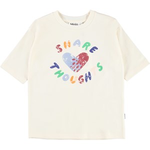 Das Reen T-Shirt ist ein weißes T-Shirt mit einem geflochtenen Herz auf dem Bauch und eine Aufforederung, deine Gedanken mit anderen zu teilen.