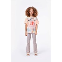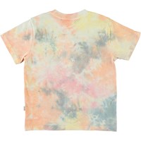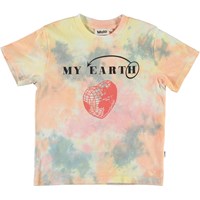 Reeve ist ein Tie-Dye T-Shirt in Pastellfarben mit Druck von Herzen und dem Text 'My Earth' auf der Vorderseite.