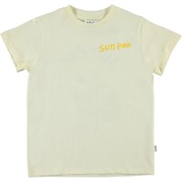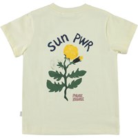 Reeve ist ein hellgelbes T-Shirt mit einem Löwenzahndruck auf der Rückseite und dem Text 'Sun Pwr' auf Vorder- und Rückseite.