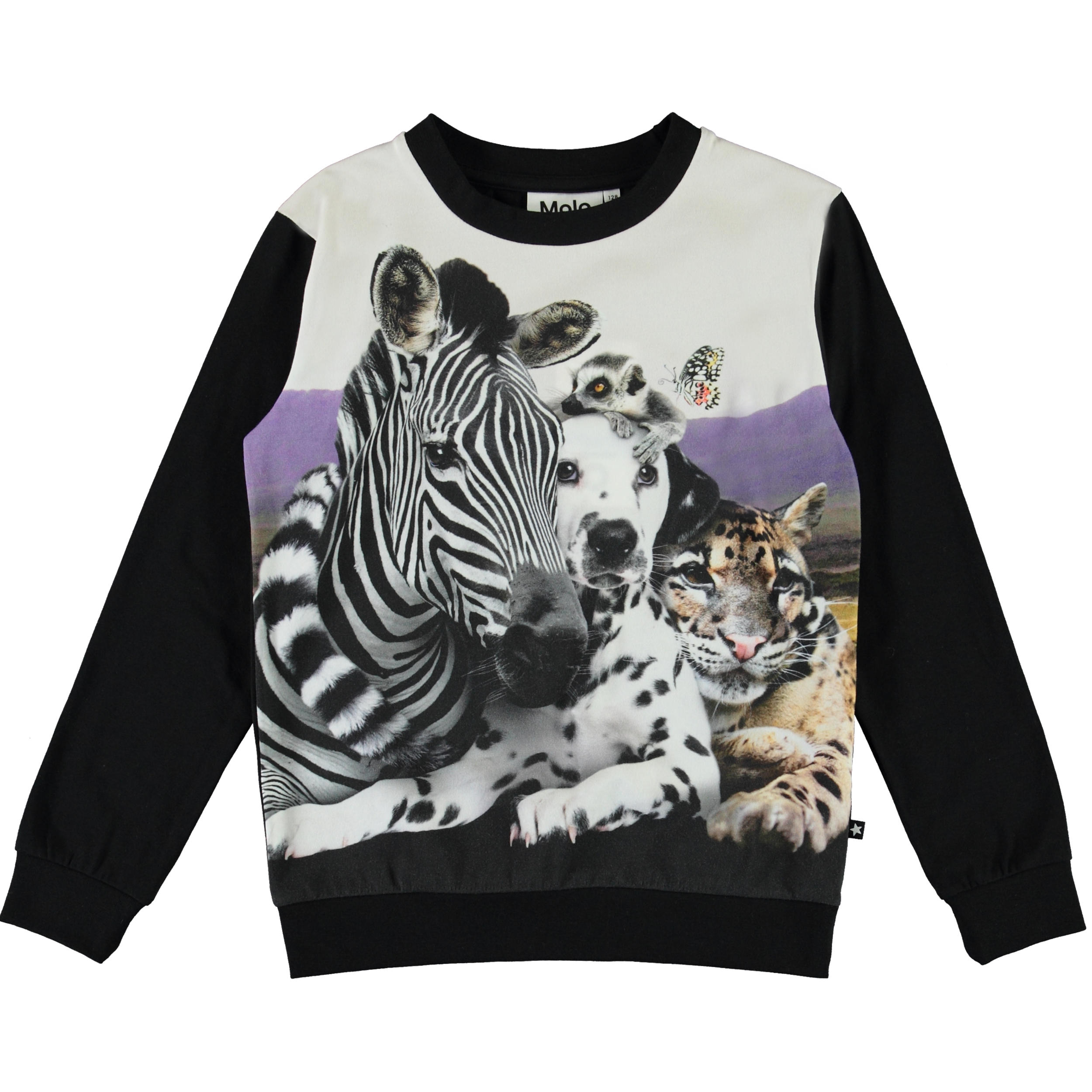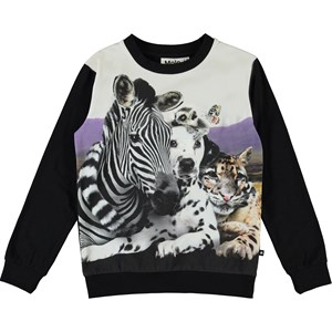 Regine ist eine schwarze Bluse mit langen Ärmeln und Druck auf der Vorderseite von verschiedene Tieren.
