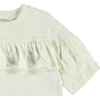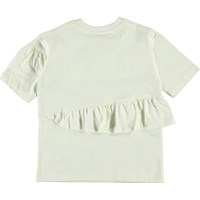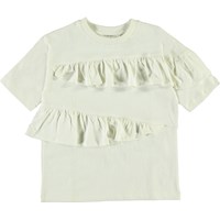 Rei ist ein weißes Kurzarm-T-Shirt mit asymmetrischen Rüschen auf der Vorderseite.