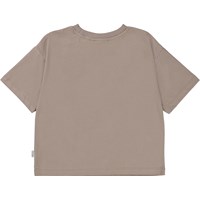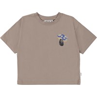 Graubraunes, kurz geschnittenes T-Shirt mit Artwork auf der Vorderseite. Das Artwork besteht aus einem kleinen fröhlichen Pilz, der einen Hut aus feinen Pailletten hat. Dieses T-Shirt besteht aus 100% Baumwolle, kurzen Ärmeln, einen Rundhalsausschnitt mit Rippbündchen und eine lockere Passform.